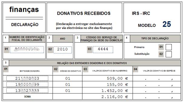 Este relatório permite imprimir o mapa do Modelo 25 que inclui todos os doadores cuja ficha tem um número de contribuinte elegível para benefício fiscal ao abrigo da lei do mecenato, com o valor doado no ano que seleccionou como ano de trabalho.